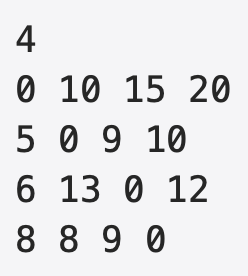 첫째 줄에 도시의 수 N이 주어진다. (2 ≤ N ≤ 16) 다음 N개의 줄에는 비용 행렬이 주어진다. 각 행렬의 성분은 1,000,000 이하의 양의 정수이며, 갈 수 없는 경우는 0이 주어진다. W[i][j]는 도시 i에서 j