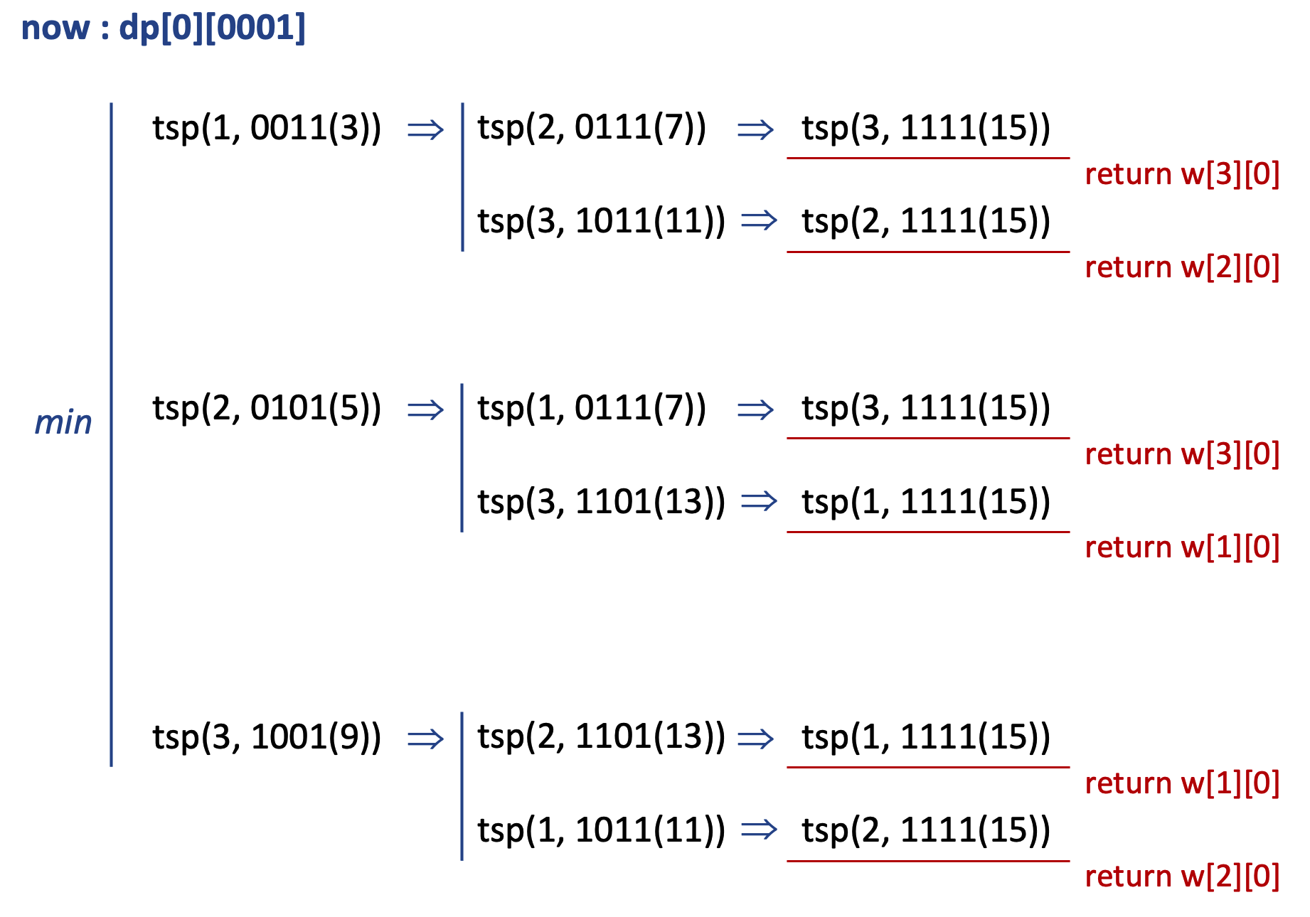 그 전까지 거치는 중간 도시에서의 각 TSP 함수는 위와 같은 과정을 통해 해당 도시 이후로 가능한 경로 중 최소값을 dp 테이블에 저장하게 된다.